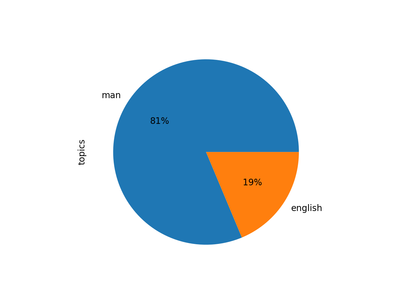 The pie chart illustrates how three-quarters of the texts are about "man" (which is similar to the result of the feature reduction modeling process, and illustrated with the dendrogram), and the bar chart illustrates how many of his journals emphasized "english":